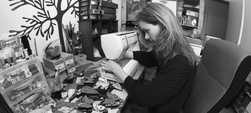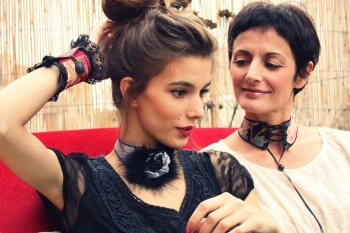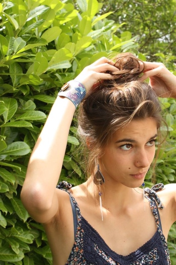 Très sensible aux matières, aux tissus ; elle mêle ainsi velours, soie sauvage ou peinte, beaux imprimés, dentelles anciennes, cuir et boutons vintage pour imaginer des accessoires variés.