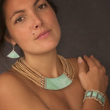 Alors qu’elle observait avec minutie les ornements de beauté qui subliment les femmes, à travers le monde et l’histoire, de l’Antiquité au Moyen-Age… Myriam constate que le matériau ancestral qu’est le verre serait idéal pour composer des bijoux design : des parures au caractère trempé qui se déclinent en colliers, bracelets et boucles d’oreilles.